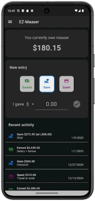 EZ-Maaser tarjoaa vaivattoman tavan seurata maaser- (tai chomesh-)lahjoituksiasi. Tämä sovellus tekee hyväntekeväisyyden hallinnasta helppoa ja selkeää, auttaen sinua pitämään kirjaa antamistasi vaivattomasti. Yksinkertainen ja tehokas ratkaisu lahjoitustesi seurantaan.